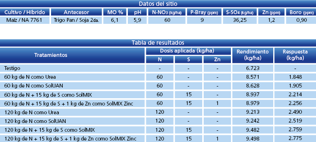 El ensayo se llevó a cabo en la localidad de Sierra de los Padres, partido de Gral. Pueyrredón (Buenos Aires) en donde se compararon distintas fuentes de N y su interacción con S y Zn. Se realizó una fertilización de base con 100 kg/ha de DAP. Se observaron respuestas de +2.700 kg/ha cuando se aplicó la mayor dosis de SolMIX.