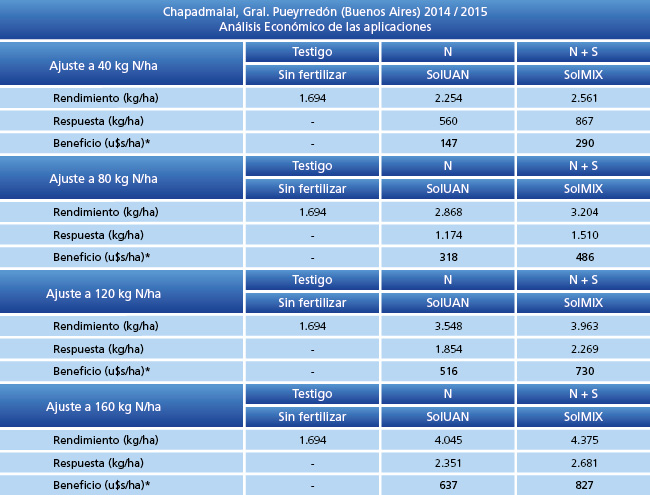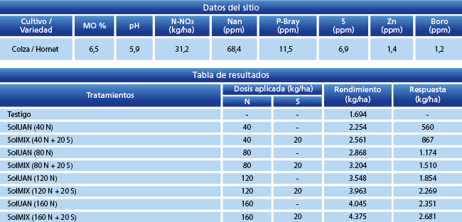 El ensayo se llevó a cabo en la localidad de Chapadmalal , partido de Gral. Pueyrredón (Buenos Aires), en donde se compararon distintas fuentes y dosis de Nitrógeno (N) y su interacción con Azufre (S). Se realizó una fertilización de base con 120 kg/ha de MAP. Se observaron respuestas de +2.600 kg/ha cuando se aplicó la dosis más alta de SolMIX.
